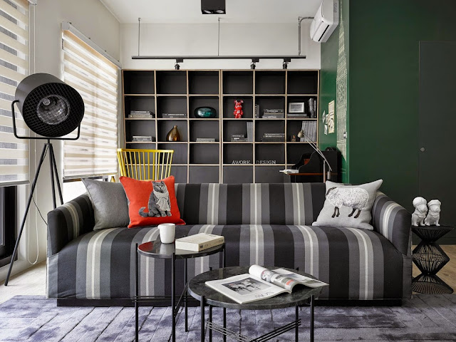 Moving forward, warm well-lit dining room is hosted by a solid rectangular oak dining table set against a canvass of cement wall sedated by solid brown and streamline grey. The living room is set next to the dining room. The newly-wed couple wishes to have more flexibility with the spaces. Therefore, the wall between the living room and study is removed. Tracks for lighting extend from the living room to the dining room to create a unified warm feeling in the spaces of domestic activities. The boundaries are blurred, but the functions are clearly defined.