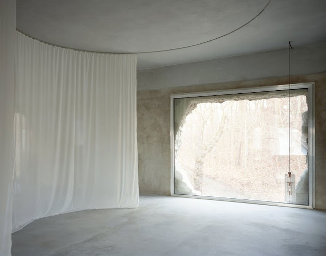 Instead of insulating the existing structure and to save costs, the façade was covered with shortcrete. To generate an open space all non-bearing walls were removed and a functional 20 square meter (215 square foot) core with the staircase, bathroom, kitchenette, fireplace as well a sauna were installed in the center of both floors. The space can be zoned by simple transparent PVC curtains according to the actual climate needs. In the summer time the curtains are retreated only to a 10 square meter (107 square foot) bedroom in the 230 square meter (2,475.7 square foot) open loft space, while in winter the heated area makes only 60 square meters (646 square feet) of the whole floor area which includes moving the bed closer to the open fire.